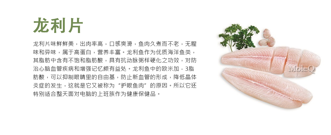 龙利片 January 10, 2017March 9, 2017 admin海鲜, 鱼类 龙利片 : 原產地: 东南亚 口感: 鲜美爽滑,无腥味 种类: 海水鱼 營養值 每份 113 克 卡路里 70 *每日%值是根据2000卡路里的饮食。取决于你的热量需求, 每天的值可能更高或更低。 量/份 %每日值* 脂肪 1.5g 2% 飽和脂肪 0.5g 2% 胆固醇 30mg 10% 钠 210mg 9% 钾 量/份%每日值* 碳水化合物 0g 0% 膳食纤维 0g 0% 糖 0g 蛋白质 14g 維生素 A 0% 維生素 C 0% 維生素 D 0% 钙 0% 維生素 B12 0% 維生素 B6 0% 镁 0% 铁 6% Article By : admin